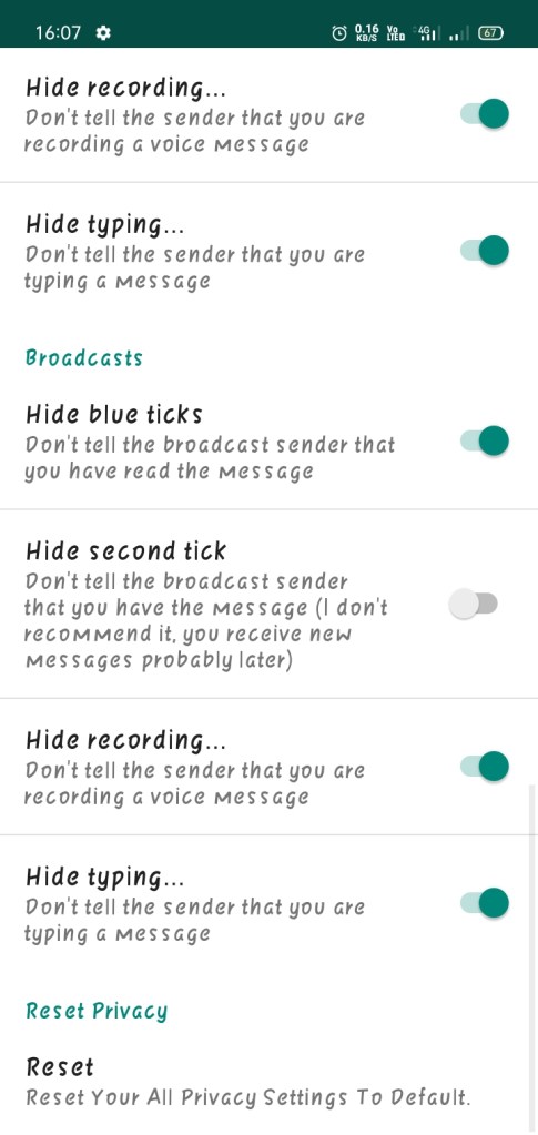 Privacy Features Added – Hide last seen, blue tick, double tick, typing, BOR etc.